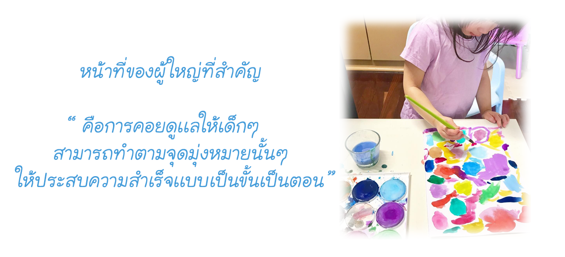 จากนั้นต่างคนต่างเล่นสีด้วยกัน ซึ่งความสนุกจากการได้เล่นคือสิ่งสำคัญ เเต่ก็ไม่ใช่ไร้ซึ่งจุดหมายไปซะทั้งหมด เพราะเด็กๆต่างนำสีที่เลือกนั้น ไปทำอะไรบางอย่างเเละเพื่อจุดประสงค์บางอย่างเป็นเเน่ ซึ่งครูศิลปะหรือพ่อเเม่ผู้ปกครอง มีเพียงหน้าที่คอยสังเกตศักยภาพของเด็กเเต่ละคนให้ออก เเล้วจึงเข้าไปช่วยเหลือหรือสร้างโอกาสให้เด็กเเต่ละคนพัฒนาศักยภาพของตนเองได้อย่างเหมาะสม จะเห็นได้ว่า กระบวนการเหล่านี้ เด็กเป็นผู้เลือกเองทั้งหมด ไม่ว่าจะเป็นประเภทของสี, วิธีการเล่น เเละจุดมุ่งหมาย "ครูเเละพ่อเเม่ไม่เกี่ยว"